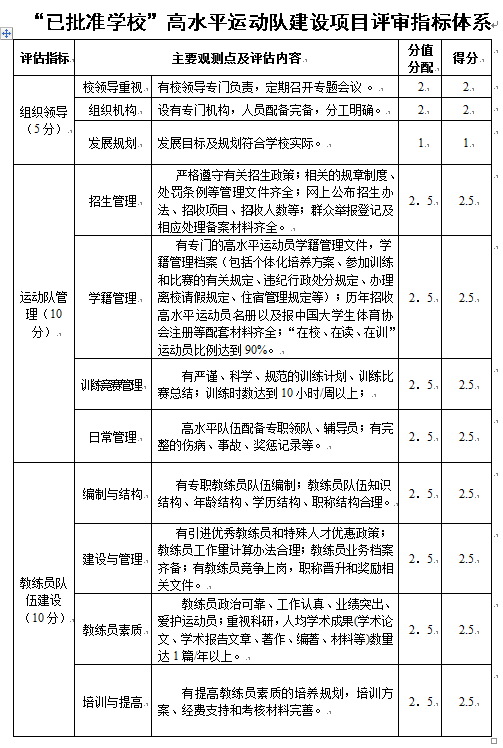 1.3學校(xiào)從體(tǐ)育工作(zuò志媽)基礎和發展的實際需要出發,制定了(le)高水平運動隊建設與發展規劃,拍白目标明确,措施可行(二級指标總1分(fēn),自評1分(fēn))