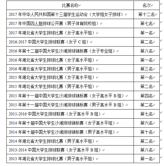 我校(xiào)是中國大學生(shēng)體(tǐ)育協會排球分村雨(fēn)會會員(yuán)學校(xiào)。2011年開始招收高水平運動員(yuán),2013-2017年連續五次參賽中國大學生(shēng)排球國麗女(nǚ)子(zǐ)高水平組比賽;2014-2016年連續三次參賽中國大學生(shēng)沙灘排球錦标賽;2017年代表湖北省大學生(shēng)女(nǚ通媽)子(zǐ)排球隊參賽全國學生(shēng)運動離會會排球比賽;2013-2017年連續五次參賽湖北省大學生(shēng)排球女(nǚ)子(zǐ)高水村友平組比賽;2013-2015年連續三次參賽湖北省大學生(shēng)排球男子(zǐ)高水平組比賽。