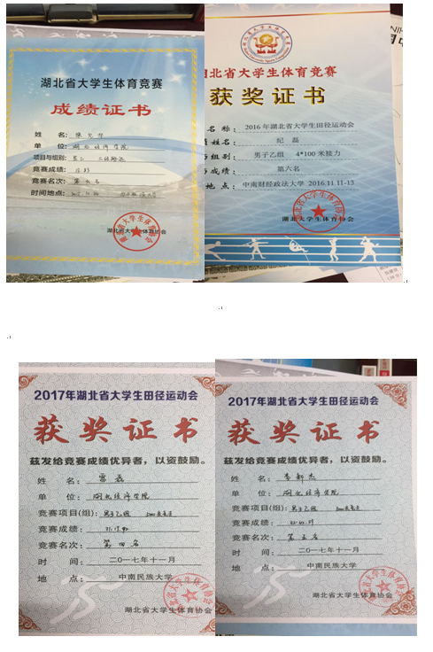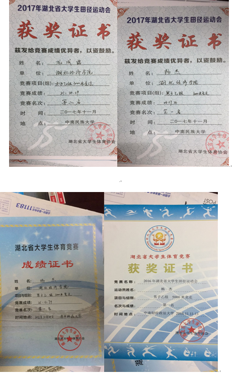 2017年湖北省大學生(shēng)運動會田徑運動會 | 男子(zǐ)乙組:5000米競走第一(yī)名、第四、第五;女(nǚ)子(zǐ)乙組:3000米第二名、跳(tiào)高第六名 |
