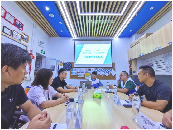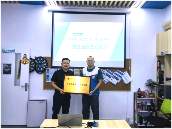 最後,雙方代表簽訂校(xiào)企合作(zuò)協議(物藍yì),高書記代表學校(xiào)為(wèi)迪卡侬(武漢)“湖北經濟學暗費院大學生(shēng)就(jiù)業實習實訓基地”授牌。